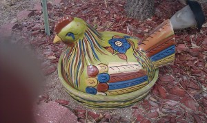 In any event, Mom’s was chickens. Specifically, ceramic chickens. Every year, Mom got a plethora* of chickens, in every shade imaginable. The only bits that linked them together were a.) hideouness and b.) … No, I lie. The only linking thing was how absolutely UGLY they were. And how apt to stare at you when you walked into a room at 3 AM, which is to say waaay after curfew. Just looking at you. Judging. Letting you know how you’ve broken your sweet Mom’s heart for being out after hours and doing god knows what until all hours.