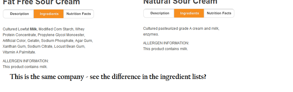 Another battle that I am having on the nutrition front is with Mister Man. He is a trauma nurse. He loves and believes in the AMA. He especially believes in their low/no-fat program of eating. For him this means using the sin grasa versions of products, especially the dairy products. And while I grok what he is saying: he worries about heart health and cholesterol and fats, I worry about eating things that more rightly belong in a chemistry set.