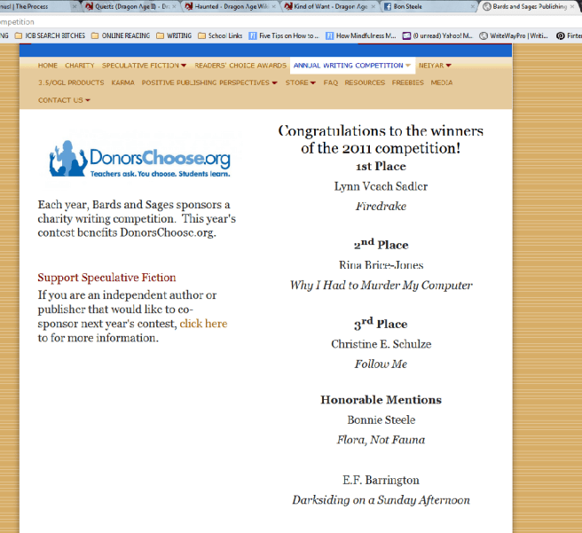 On December 18th, I got notice that I was an Honorable Mention. I couldn’t say anything until they made the announcements, though. I’ve been sitting on this gnus! for a half month. You can imagine the flailing that has been happening. Kermie-dances galore, people.